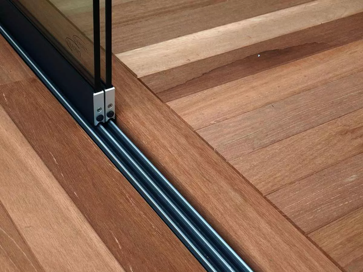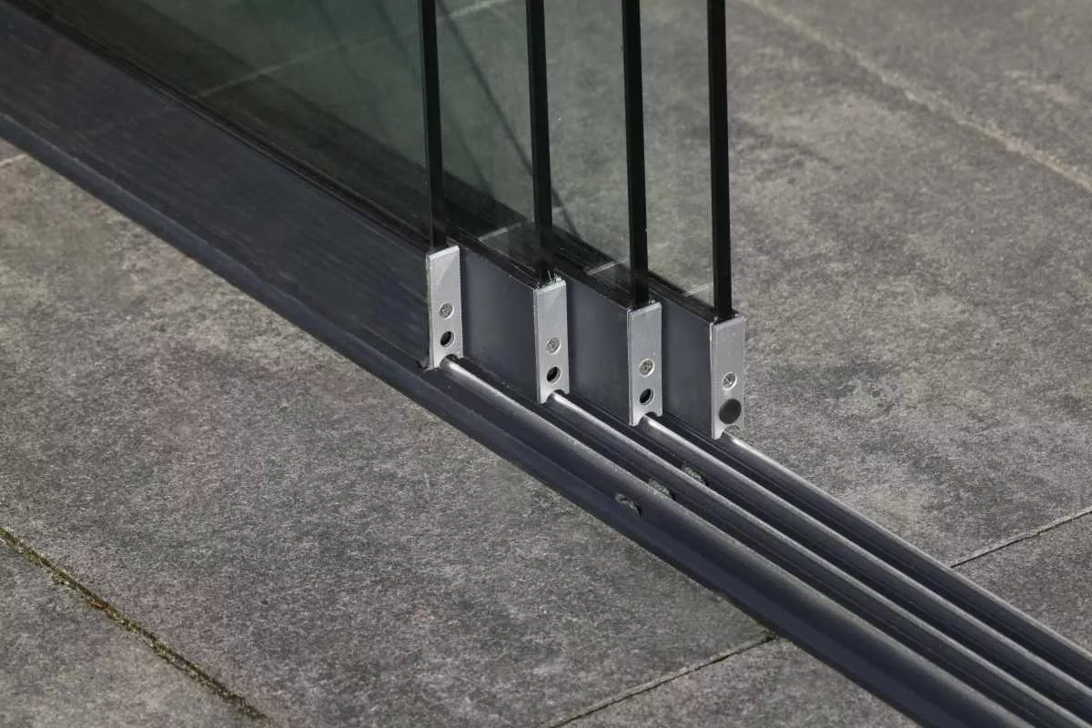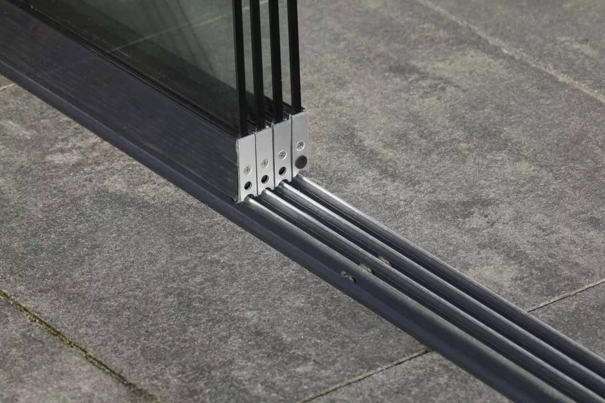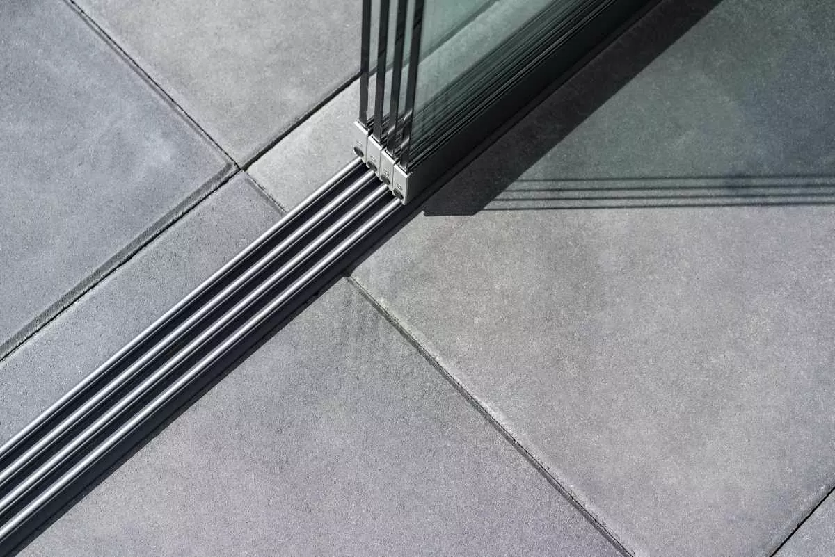 Die Kombination aus stabiler Oberschiene mit Bürstenprofilen und einer flachen Bodenschiene gewährleistet eine sichere Führung sowie einen komfortablen, nahezu barrierearmen Übergang