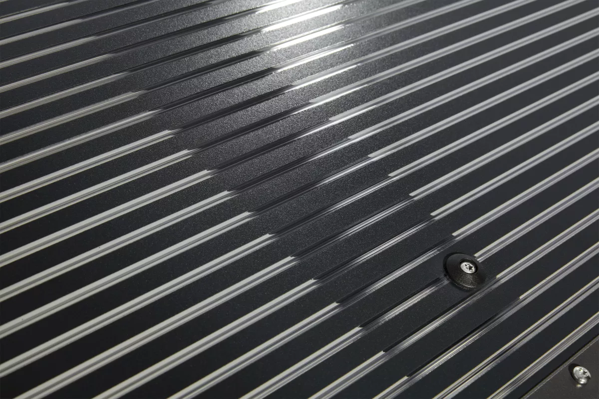 Die stabilen Tragarme bestehen aus pulverbeschichtetem Aluminium und sind in einem Neigungswinkel von 20° ausgeführt. Dadurch wird Regenwasser zuverlässig abgeleitet und eine optimale Stabilität gewährleistet.
