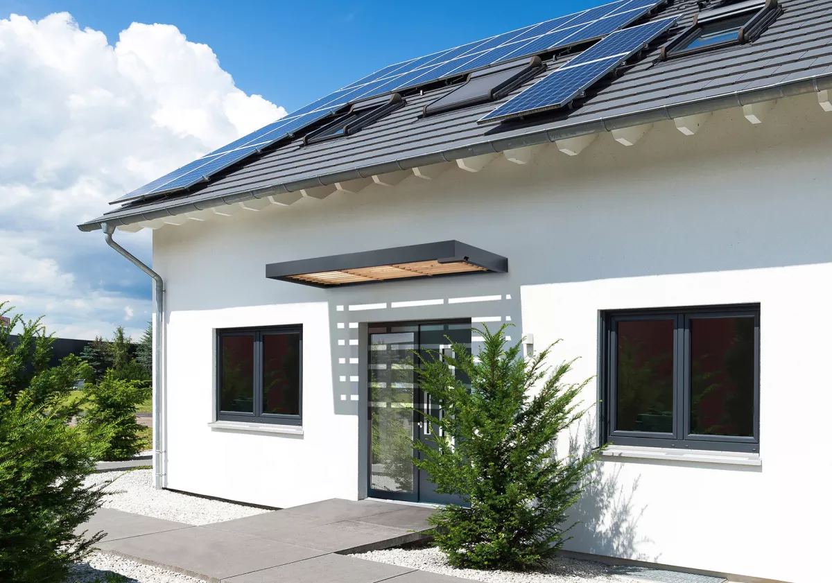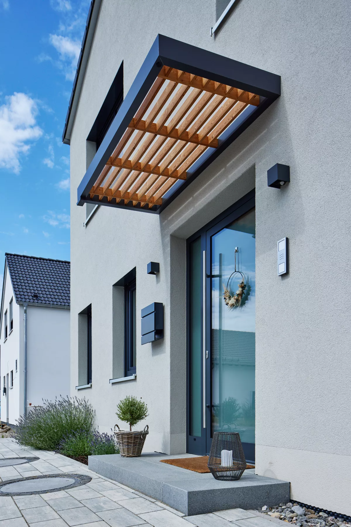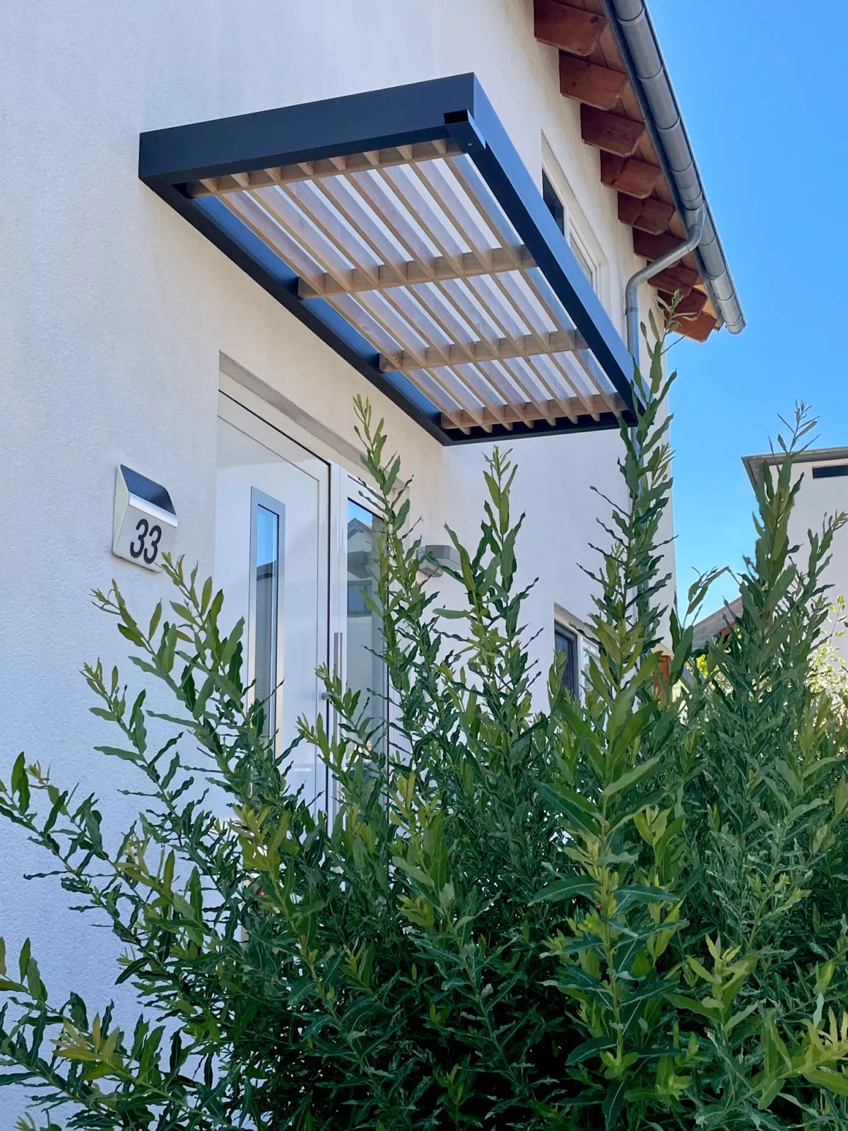 Mit einer Tiefe von 90 cm bietet das Vordach großzügigen Schutz für Haustür und Eingangsbereich.
